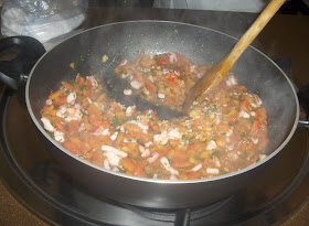 Then we peeled and chopped 6 tomatoes. Katia runs the blunt side of a blade over the skin, which then comes away more easily: